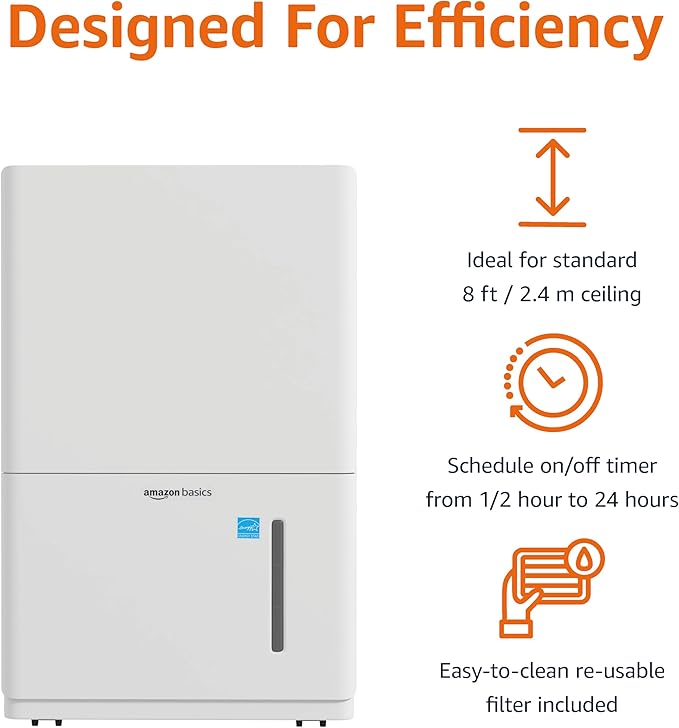 Amazon Basics Large Dehumidifier for Rooms, Energy Star Certified, Effectively Reduces Humidity, Timer, Auto-Defrost, Overflow Protection, up to 2500 SFT, 35 Pint, White