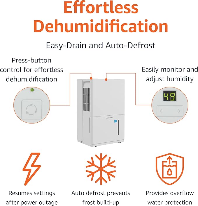 Amazon Basics Large Dehumidifier for Rooms, Energy Star Certified, Effectively Reduces Humidity, With Continuous Drain Pump, Timer, Auto-Defrost, Overflow Protection, up to 4000 SFT, 50 Pint, White