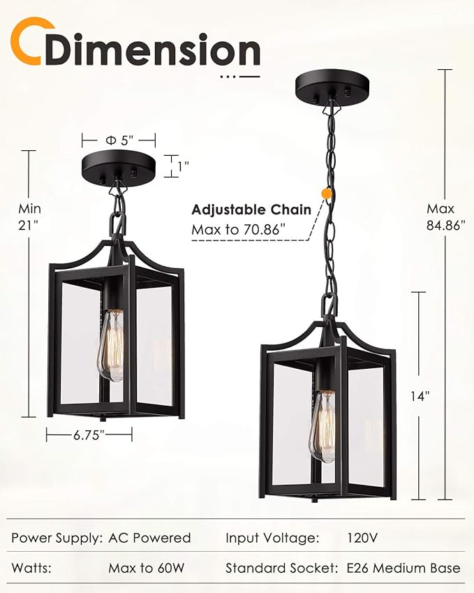 - [MODERN OUTDOOR HANGING LIGHTS] This outdoor hanging lantern is made of straight line metal construction and clear glass in sanded black finish, whether you're looking to illuminate backyard get-together or guest welcome front door, this hanging porch light is here to help.