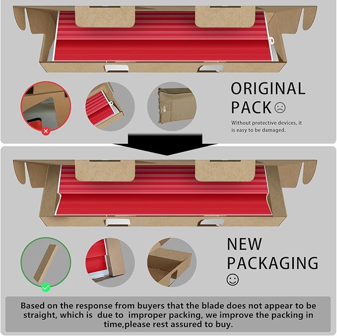 - [Upgrade Packaging] -In accordance with buyer feedback that the blade does not appear to be straight when they receive the goods, we feel sorry for that. We'll not promise no any damage to the items in transit. We change the product packaging(Put the pearl cotton on both sides of the product and strength the hardness of the carton)so it can prevent items from being damage in transit