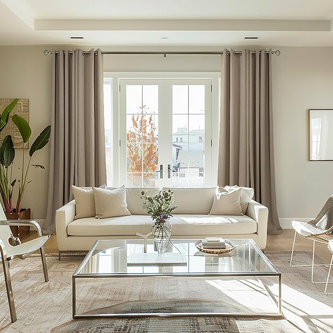 - BGment Faux Linen Curtains: This set includes 2 taupe linen-like curtains, each measuring 52x108 inches. With 8 silver grommets, they easily fit rods less than 1.6 inches in diameter for quick and hassle-free installation.