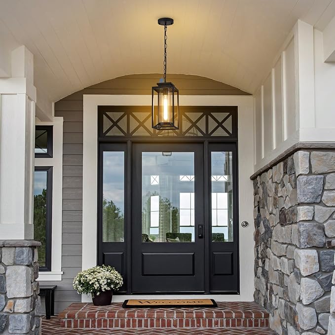 - Modern Black Outdoor Pendant Lighting: This outdoor chandelier for porch is made of classic square metal construction and clear glass in sanded black finish, whether you're looking to illuminate backyard get-togethers or guest welcome front door, this porch hanging light is here to help
