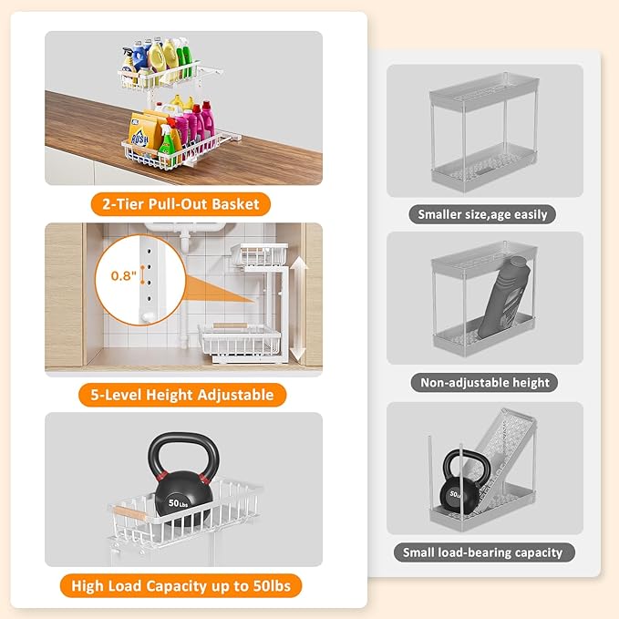 - ๐ Industrial-Grade Stability: Engineered with thicker, heavier steel + 1" reinforced frame, this premium under kitchen sink organizer delivers wobble-free durability for heavy loads. The weighted base design creates rock-solid stability, making it the ultimate long-term under cabinet organizer for bulky detergents
