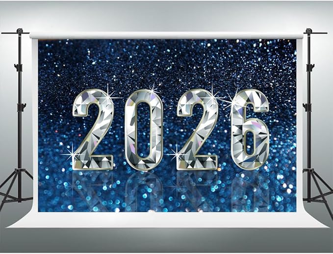 YongFoto 2026 Happy New Year Backdrop 10x7ft Diamond Sparkle Blue Photography Background Christmas Night Festival Carnival Celebration Party Banquet Decor Banner Photoshoot Wallpaper Photo Booth