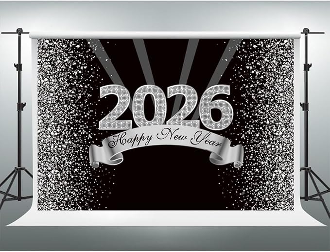 YongFoto 2026 Happy New Year Backdrop 10x5ft Black Silver Photography Background Merry Christmas Night Festival Carnival Celebration Party Banquet Decor Banner Photoshoot Wallpaper Photo Booth