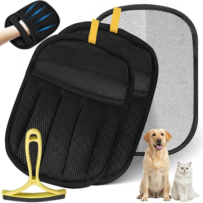 - 2025 UPGRADED PET HAIR REMOVAL GLOVE SET — Tired of sticky rollers and flimsy gloves that barely pick up hair? Our black XL pet hair removal gloves (7x9.44”) feature soft electrostatic fibers that attract cat and dog hair like a magnet — no waste, no mess, just effortless cleaning. Includes 2 reusable gloves + 1 curved yellow brush for a complete home and pet care solution.
